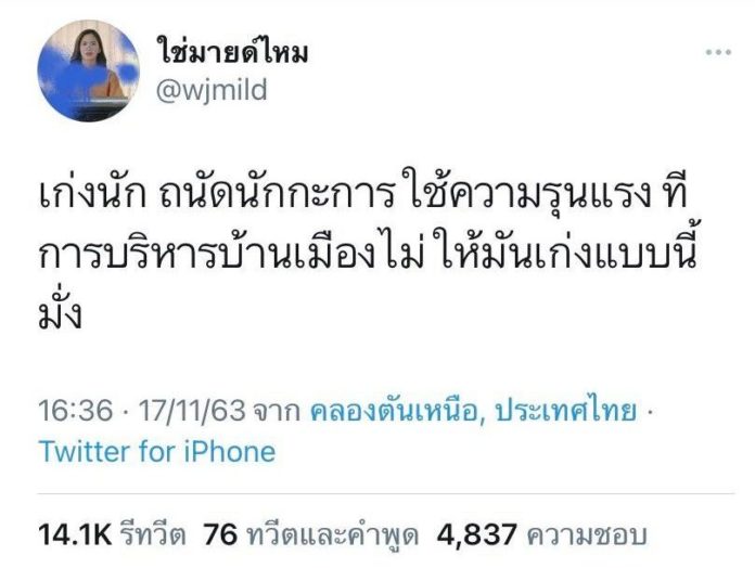 ล่าสุด “วีเจมายด์” หรือ “มายด์-ลภัสลัล จิรเวชสุนทรกุล” โพสต์ผ่านทวิตเตอร์ส่วนตัวถึงสถานการณ์ดังกล่าวว่า “เก่งนัก ถนัดนักกับการใช้ความรุนแรง ทีการบริหารบ้านเมืองไม่ให้มันเก่งแบบนี้มั่ง”