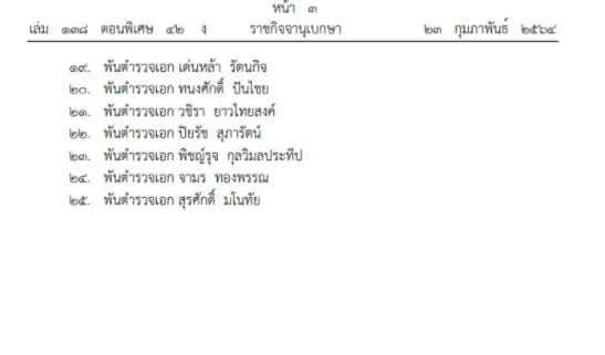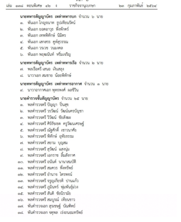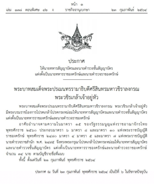 วันที่ 23 กุมภาพันธ์ 2564 เว็บไซต์ราชกิจจานุเบกษา เผยแพร่ประกาศให้นายทหารสัญญาบัตรและนายตำรวจชั้นสัญญาบัตร แต่งตั้งเป็นนายทหารราชองครักษ์ และนายตำรวจราชองครักษ์ โดยว่า