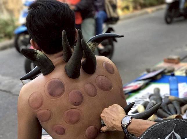 ถ้าพูดถึงการครอบแก้วเพื่อการบำบัดแบบจีน คงไม่ใช่เรื่องแปลกใหม่อะไร เพราะหลายคนก็คงเคยทำลองหรือเคยเห็นในหนังในละครมาแล้ว แต่สำหรับที่อินโดนีเซีย นอกจากการใช้แก้วแล้ว ยังมีการนำ ‘เขาควาย’ มาใช้ในวิธีการแบบเดียวกัน แถมยังรักษากันริมทางเท้าอีกต่างหาก ซึ่งจากข้อมูลพบว่าการบำบัดด้วยวิธีดังกล่างนั้นเป็นเทคนิคการดูดเพื่อช่วยกระตุ้นการไหลเวียนของเลือดในร่างกาย ทั้งยังมีสรรพคุณแก้อาการปวดเมื่อย ในขณะที่มีบางคนถึงขั้นบอกว่าสามารถขับเซลล์เม็ดเลือดแดงที่ตายแล้วออกจากร่างกายได้อีกด้วย