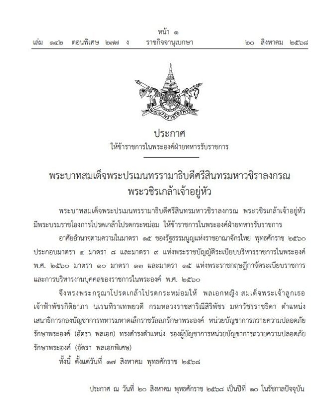 เมื่อวันที่ 20 สิงหาคม 2568 เว็บไซต์ราชกิจจานุเบกษาได้เผยแพร่ประกาศพระบรมราชโองการให้ข้าราชการในพระองค์ฝ่ายทหารรับราชการ