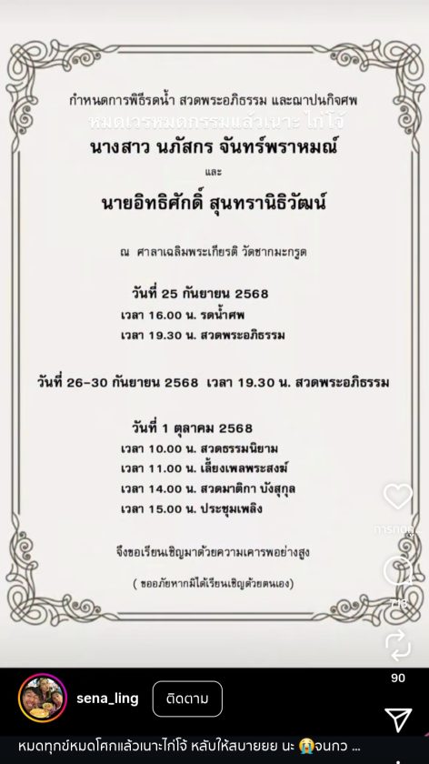 เสนาลิงได้โพสต์ภาพกำหนดการพิธีสวดอภิธรรมศพของน้องสาวผ่านอินสตาแกรม พร้อมข้อความสุดอาลัยว่า “หมดทุกข์หมดโศกแล้วเนาะไก่โจ้ หลับให้สบายยย นะ 😭จนกว่าจะพบกันใหม่เนาะ #รัก รักหนูนะ ทำไมรีบไปจัง” ซึ่งแสดงถึงความรักและความผูกพันที่มีต่อผู้จากไปเป็นอย่างมาก โดยพิธีจะจัดขึ้น ณ ศาลาเฉลิมพระเกียรติ วัดชากมะกรูด ตั้งแต่วันที่ 25-30 กันยายน และจะมีพิธีฌาปนกิจศพในวันที่ 1 ตุลาคม 2568