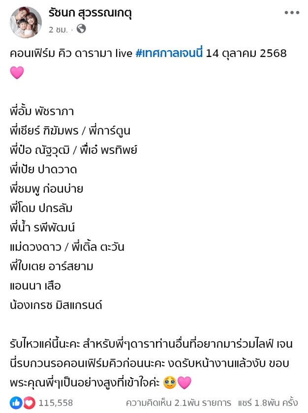 โดย เจนนี่ ได้โพสต์อัพเดทคิวพร้อมกับปิดท้ายแบบติดตลกเล็กน้อยว่า “รับไหวแค่นี้นะคะ สำหรับพี่ๆ ดาราท่านอื่นที่อยากมาร่วมไลฟ์ เจนนี่รบกวนรอคอนเฟิร์มคิวก่อนนะคะ งดรับหน้างานแล้วงับ ขอบพระคุณพี่ๆ เป็นอย่างสูงที่เข้าใจค่ะ 🥹🩷”