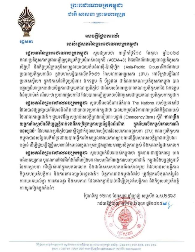 ในแถลงการณ์ที่เผยแพร่เมื่อวันที่ 19 ต.ค. 68 รัฐสภากัมพูชาชี้แจงว่า คณะผู้แทนรัฐสภากัมพูชาได้เข้าร่วมการประชุมอาเซียน +3 และการประชุมกลุ่มเอเชีย-แปซิฟิก ระหว่างการประชุมสมัชชาใหญ่สหภาพรัฐสภา (IPU) ครั้งที่ 151 ณ กรุงเจนีวา ประเทศสวิตเซอร์แลนด์