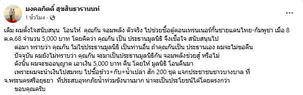 นายมงคลกิตติ์ ระบุว่า เมื่อวันที่ 8 ตุลาคม 2568 ตนได้โอนเงินจำนวน 5,000 บาทให้กับ “คุณกัน จอมพลัง” โดยมีเจตนาสนับสนุนการทำงานเพื่อประเทศชาติ และเข้าใจว่า “กัน จอมพลัง” เป็นประธานมูลนิธิดังกล่าว จึงให้ความเชื่อใจและสนับสนุนไป