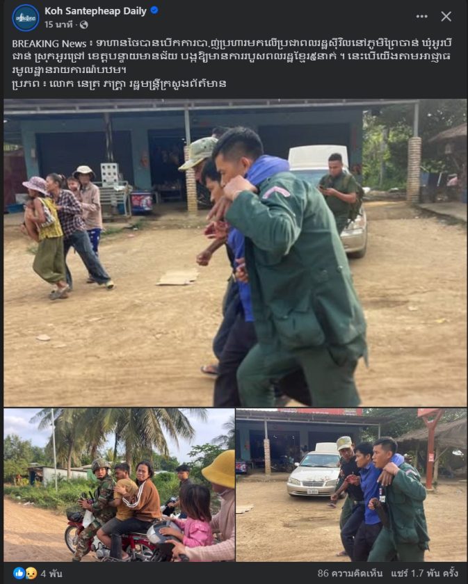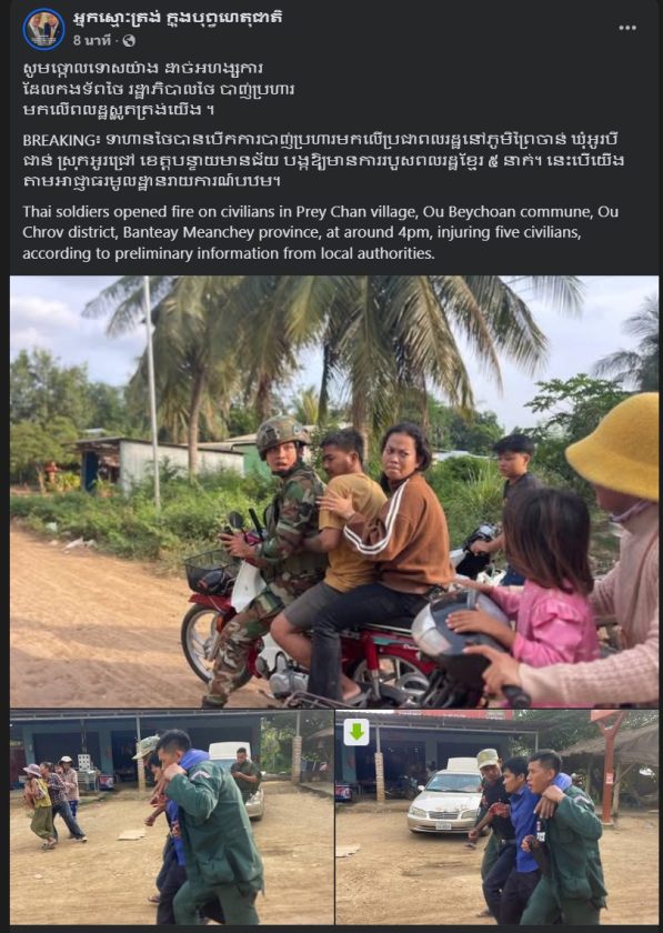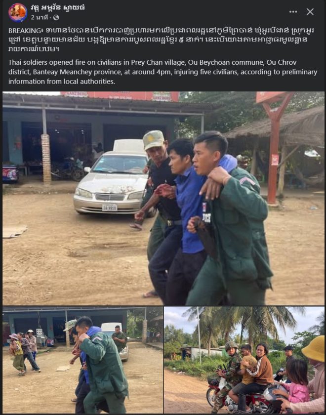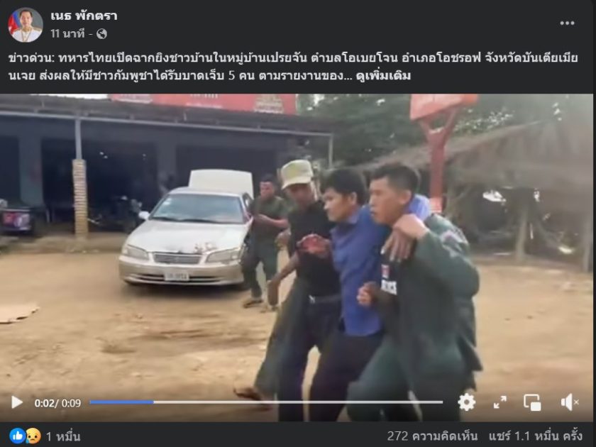 มีรายงานล่าสุดว่า นายเนธ พักตรา รัฐมนตรีว่าการกระทรวงสารสนเทศกัมพูชา พร้อมด้วยสื่อหลักและสังคมออนไลน์ของกัมพูชา ได้โพสต์และแชร์คลิปวิดีโอและภาพอย่างกว้างขวาง โดยกล่าวหาทหารไทยว่า เป็นผู้เปิดฉากยิงใส่ชาวบ้านกัมพูชาที่หมู่บ้านเปรยจัน ตำบลโอเบยโจน อำเภอโอชรอฟ จังหวัดบันเตียเมียนเจย จนมีผู้ได้รับบาดเจ็บ 5 ราย เมื่อเวลาประมาณ 16.00 น. วันที่ 12 พ.ย. 2025 ซึ่งหลังเกิดเหตุ เจ้าหน้าที่ฝ่ายปกครองและหน่วยงานความมั่นคงของกัมพูชาได้เร่งเข้าพื้นที่เพื่อช่วยเหลือผู้บาดเจ็บและตรวจสอบสถานการณ์ทันที