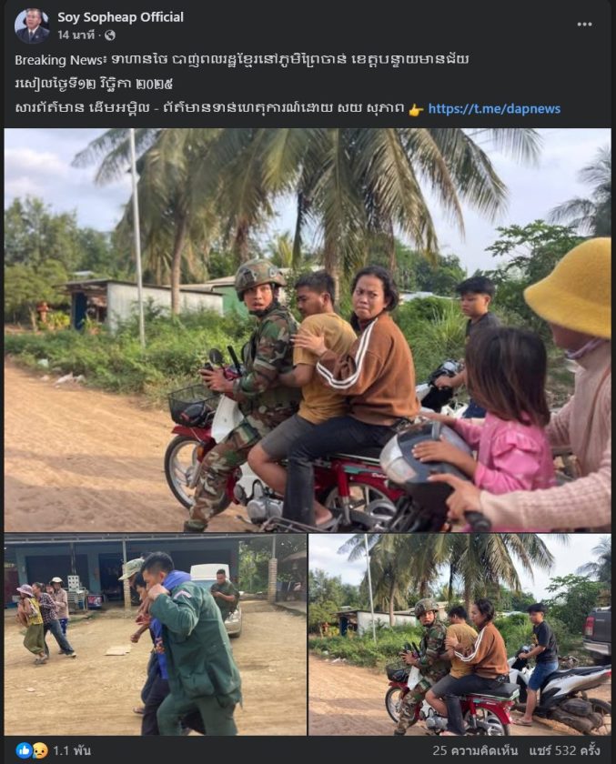วันที่ 12 พ.ย. 2568 เพจ Army Military Force ได้เผยแพร่โพสต์ ที่ทางเขมร จัดฉากใส่ร้ายประเทศไทยว่า