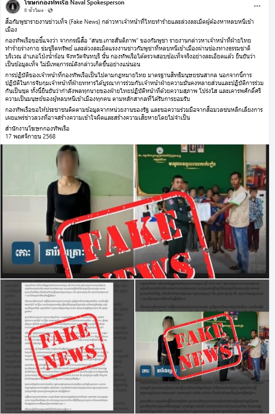 วันที่ 17 พ.ย.2568 สำนักงานโฆษกกองทัพเรือ ได้ออกมาชี้แจง ภายในโลกโซเชียล สื่อกัมพูชารายงานข่าวเท็จ บิดเบือนภาพลักษณ์ประเทศไทย โดยมีเรื่องอยู่ว่า