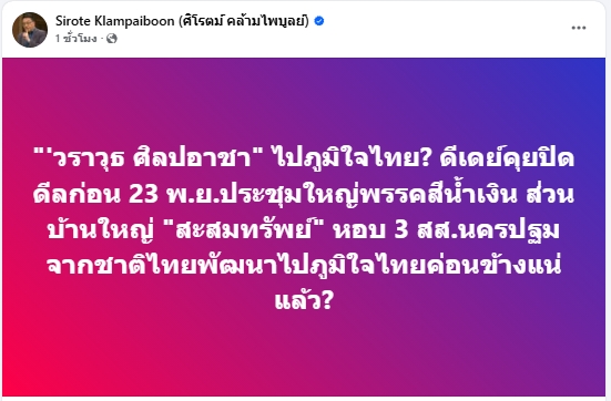 เมื่อเฟซบุ๊ก Sirote Klampaiboon (ศิโรตม์ คล้ามไพบูลย์) ได้โพสต์ว่า “‘วราวุธ ศิลปอาชา” ไปภูมิใจไทย? ดีเดย์คุยปิดดีลก่อน 23 พ.ย.ประชุมใหญ่พรรคสีน้ำเงิน ส่วนบ้านใหญ่ “สะสมทรัพย์” หอบ 3 สส.นครปฐมจากชาติไทยพัฒนาไปภูมิใจไทยค่อนข้างแน่แล้ว?