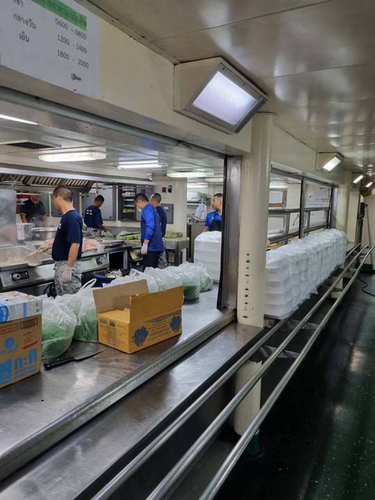 ทั้งนี้ กำลังพลประจำโรงครัวได้จัดเตรียมอาหารปรุงสุกและน้ำดื่ม จำนวน 3,000 ชุด เพื่อส่งมอบให้ประชาชนในพื้นที่ประสบภัยในหลายจุดที่การสัญจรทางบกยังเข้าถึงได้ยาก โดยได้จัดอากาศยานเฮลิคอปเตอร์ของกองทัพเรือทำการลำเลียงสิ่งของบรรเทาทุกข์ดังกล่าวขึ้นบินในช่วงเช้าของวันนี้แล้ว
