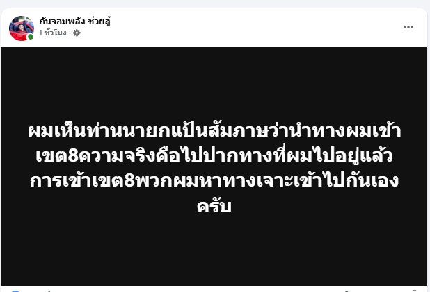 “ผมเห็นท่านนายกแป้นสัมภาษณ์ว่านำทางผมเข้าเขต 8 ความจริงคือไปแค่ปากทางที่ผมไปอยู่ แล้วการเข้าเขต 8 พวกผมหาทางเจาะเข้าไปกันเองครับ”