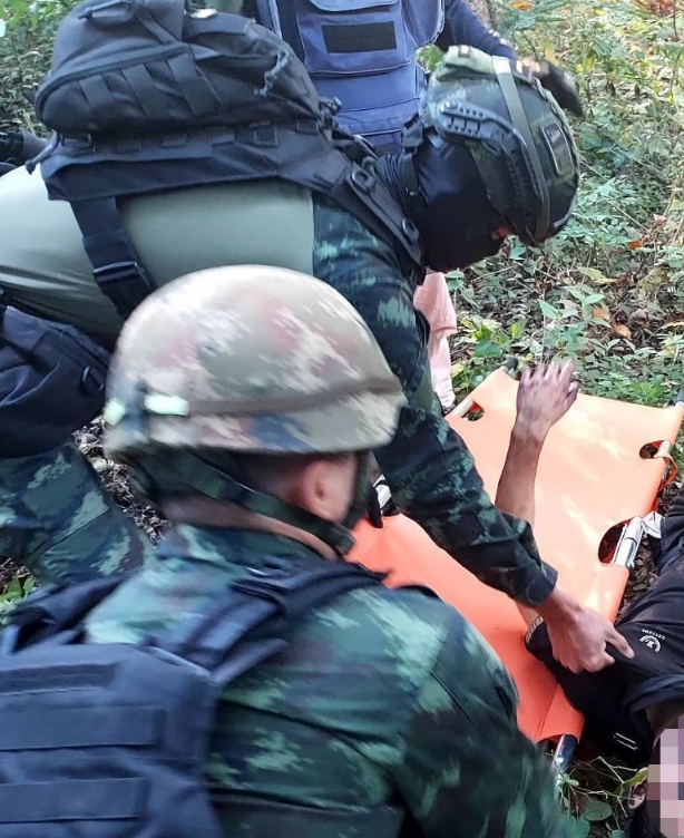 หน่วยฯ ได้นำโดรนขึ้นบินเพื่อประเมินพื้นที่อย่างละเอียด ก่อนพบชายชาวต่างชาติอยู่ในจุดเกิดเหตุ มีอาการบาดเจ็บสาหัสและร้องขอความช่วยเหลือเป็นภาษาอังกฤษ ตรวจสอบเบื้องต้นพบว่าเป็น ชายชาวจีน อายุ 26 ปี จากมณฑลยูนนาน ซึ่ง ขาขวาขาด คาดว่าเกิดจากการเหยียบทุ่นระเบิดที่ฝังอยู่ในพื้นที่ปนเปื้อน