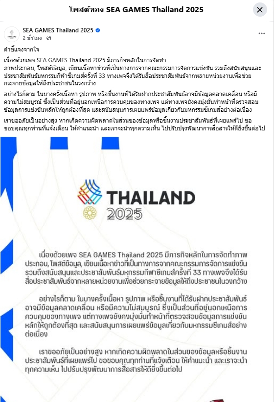 (4 ธ.ค. 68) เพจเฟซบุ๊ก SEA GAMES Thailand 2025 โพสต์แถลงชี้แจงพร้อมอภัย เกี่ยวกับความผิดพลาดในส่วนของข้อมูลหรือชิ้นงานประชาสัมพันธ์ ซีเกมส์ 2025 ที่คลาดเคลื่อนและเผยแพร่ออกไป