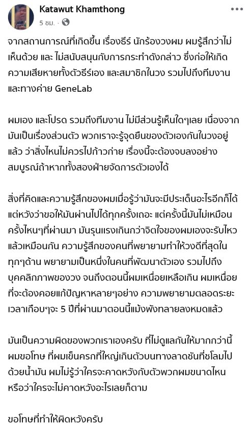 โดย “เฟรม” ระบุว่า ตนรู้สึกไม่เห็นด้วยและไม่สนับสนุนการกระทำดังกล่าวของธีร์ ซึ่งสร้างความเสียหายให้กับทั้งตัวธีร์เอง, สมาชิกในวง, ทีมงาน รวมไปถึงค่าย GeneLab พร้อมยืนยันชัดเจนว่า “ผมเอง และโปรด (มือกีตาร์) รวมถึงทีมงาน ไม่มีส่วนรู้เห็นใดๆ เลย เนื่องจากมันเป็นเรื่องส่วนตัว”