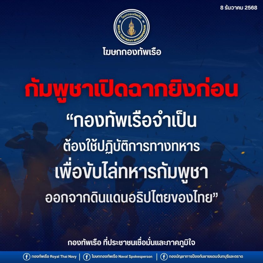วันที่ 9 ธ.ค.68 พลเรือตรี ปารัช รัตนไชยพันธ์ โฆษกกองทัพเรือ ชี้แจงว่าสถานการณ์บริเวณพื้นที่ชายแดนไทย–กัมพูชา ด้านจังหวัดตราด บริเวณบ้านหนองรี ต.ชำราก อ.เมือง จว.ตราด ซึ่งปรากฏชัดเจนจากภาพถ่ายทางอากาศล่าสุดว่ามีกำลังทหารกัมพูชาเข้ามาตั้งฐานปฏิบัติการอยู่ในเขตอธิปไตยของไทยอีกภายหลังที่บ้าน 3 หลัง ซึ่งเป็นสิ่งปลูกสร้างถาวรและฐานที่มั่นของฝ่ายทหารกัมพูชาได้ถูกรื้อทำลาย รวมทั้งทหารกัมพูชาได้ถอนกำลังไปแล้วอย่างไรก็ตาม กองกำลังทหารกัมพูชาได้ย้อนกลับมารุกล้ำอธิปไตยอีก รวมทั้งมีการเพิ่มเติมกำลังในพื้นที่ กรณีนี้ ฝ่ายไทยได้ดำเนินการตามขั้นตอนตามหลักสากลจากเบาไปหาหนัก ทั้งการประสานแจ้งเตือน และการเจรจากับฝ่ายกัมพูชาในทุกระดับ เพื่อให้ถอนกำลังออกจากพื้นที่ของฝ่ายไทยโดยเร็ว