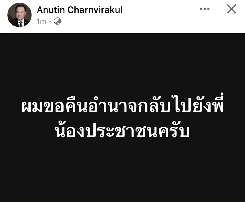 (11 ธ.ค. 2568) “นายอนุทิน ชาญวีรกูล” นายกรัฐมนตรี และรัฐมนตรีว่าการกระทรวงมหาดไทย ได้สร้างความฮือฮาทางการเมืองครั้งใหญ่ ด้วยการโพสต์ข้อความผ่านเฟซบุ๊กส่วนตัวระบุข้อความสั้นๆ แต่ชัดเจนว่า “ผมขอคืนอำนาจกลับไปยังพี่น้องประชาชนครับ” ซึ่งเป็นการส่งสัญญาณการยุบสภาอย่างเป็นทางการ