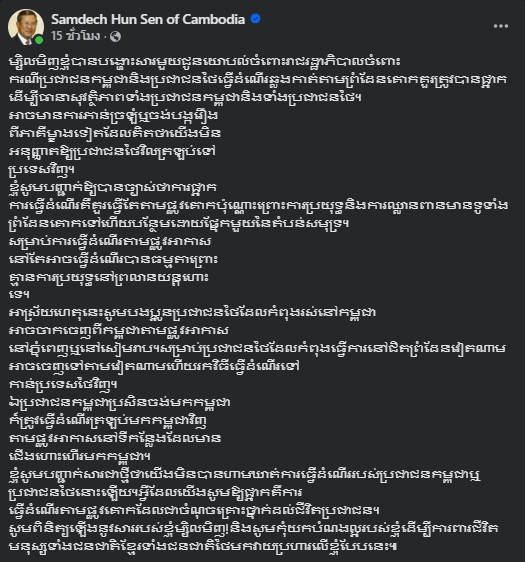 เมื่อวันที่ 14 ธ.ค. 2568 ฮุน เซน โพสต์ผ่านเฟซบุ๊ก Samdech Hun Sen of Cambodia ชี้แจงว่า “ข้อเสนอให้ระงับการเดินทางมีเป้าหมายเฉพาะ เส้นทางทางบก เพื่อความปลอดภัย ไม่ได้ห้ามการเดินทางของประชาชนไทยหรือกัมพูชา”