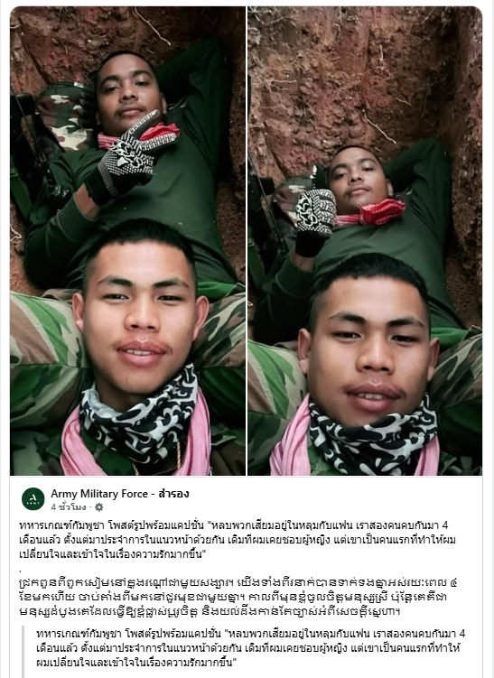 โลกออนไลน์เกิดกระแสวิพากษ์วิจารณ์อย่างกว้างขวาง หลังทหารเกณฑ์กัมพูชารายหนึ่งโพสต์ภาพถ่ายขณะหลบอยู่ในหลุมสนามเพลาะ พร้อมแคปชั่นเปิดใจถึงความสัมพันธ์ส่วนตัว โดยระบุว่าอยู่ในหลุมเดียวกับแฟน และทั้งสองคบหากันมาเป็นเวลา 4 เดือนแล้ว นับตั้งแต่มาประจำการในแนวหน้าด้วยกัน