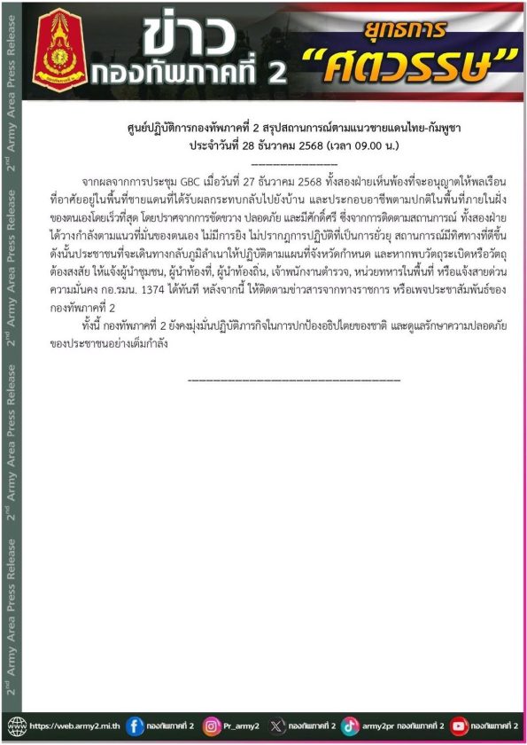 ศูนย์ปฏิบัติการกองทัพภาคที่ 2 สรุปสถานการณ์ตามแนวชายแดนไทย-กัมพูชา ประจำวันที่ 28 ธ.ค. 68 (เวลา 09.00 น.)