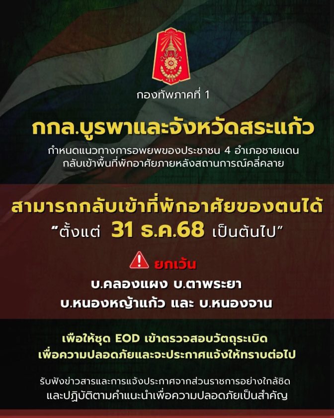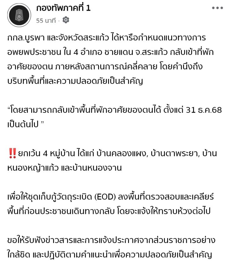 โดยทางกองทัพภาคที่ 1 ได้ประกาศชัดถ้อยชัดคำว่า สถานการณ์ตอนนี้เริ่มคลี่คลายลงแล้ว จึงมีมติกำหนดให้พี่น้องประชาชนเริ่มเดินทางกลับเข้าที่พักอาศัยได้ ตั้งแต่วันที่ 31 ธันวาคม 2568 เป็นต้นไป เรียกได้ว่าเป็นของขวัญปีใหม่ชิ้นใหญ่ให้ได้กลับไปฉลองที่บ้านตัวเองกันแบบแฮปปี้สุดๆ ไปเลยค่ะ!