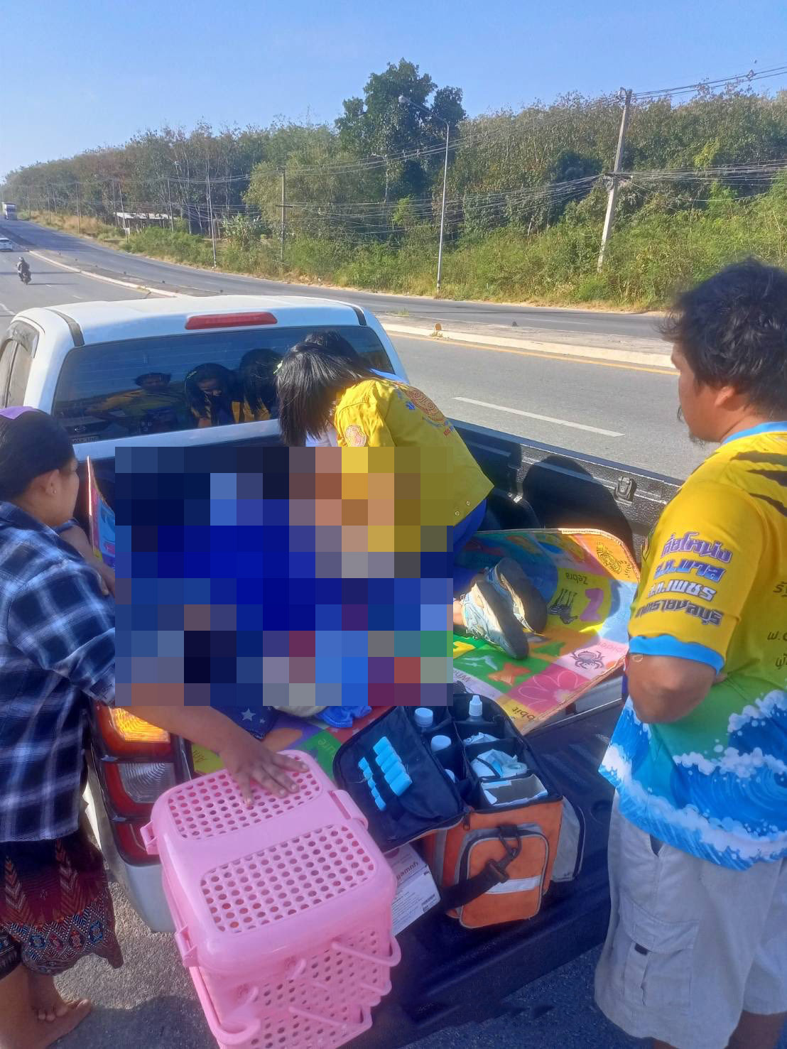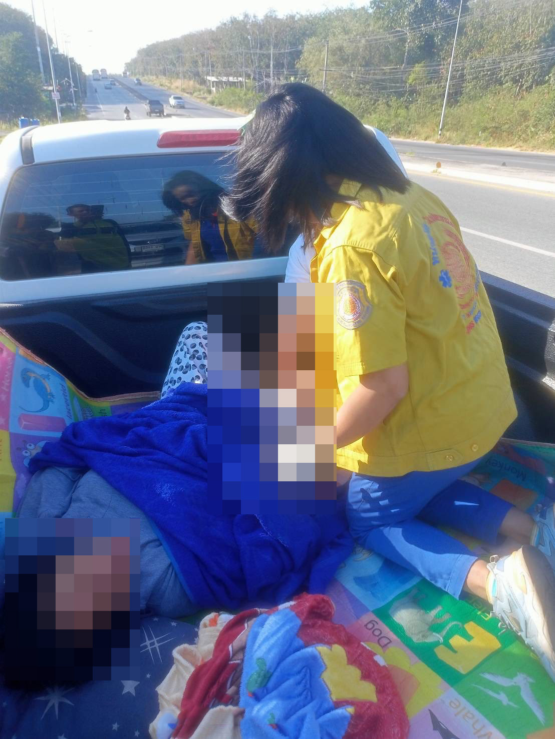 ที่เกิดเหตุพบรถกระบะสีขาว ทะเบียน จอ-2653 ชลบุรี จอดอยู่ริมถนน บริเวณท้ายกระบะพบหญิงชาวมอญ สัญชาติเมียนมา อายุประมาณ 30 ปี นอนรอความช่วยเหลือ เจ้าหน้าที่กู้ภัยจึงเร่งให้การปฐมพยาบาลและช่วยทำคลอดฉุกเฉิน กระทั่งสามารถทำคลอดได้อย่างปลอดภัย ทารกเป็นเพศชาย มีร่างกายแข็งแรงสมบูรณ์