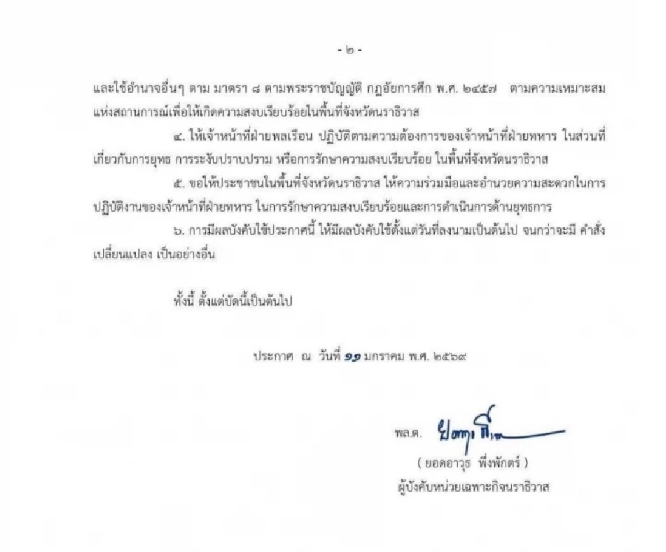 วันนี้ (11 ม.ค. 2569) พล.ต.ยอดอาวุธ พึ่งพักตร์ ผู้บังคับหน่วยเฉพาะกิจนราธิวาส ออกประกาศเพิ่มมาตรการรักษาความปลอดภัยในพื้นที่จังหวัดนราธิวาส ภายใต้อำนาจตามพระราชบัญญัติกฎอัยการศึก พ.ศ.2457 หลังเกิดเหตุลอบวางระเบิดและความไม่สงบในพื้นที่ภาคใต้รวม 11 จุด