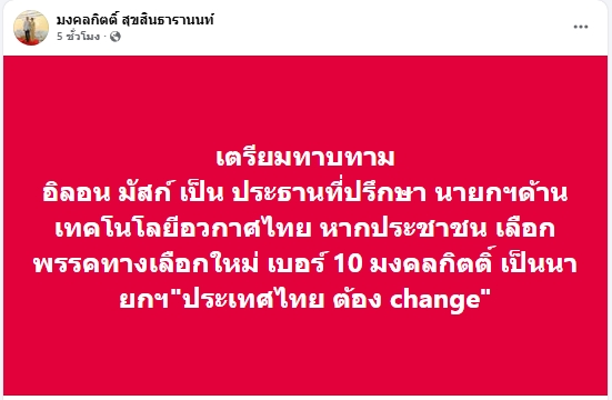 หากประชาชนเลือกพรรคทางเลือกใหม่ เบอร์ 10 และตนได้เป็นนายกรัฐมนตรี จะเตรียมทาบทาม “อีลอน มัสก์” มหาเศรษฐีเจ้าของ SpaceX เป็นประธานที่ปรึกษานายกฯ ด้านเทคโนโลยีอวกาศของไทย พร้อมย้ำว่า “ประเทศไทยต้อง change”