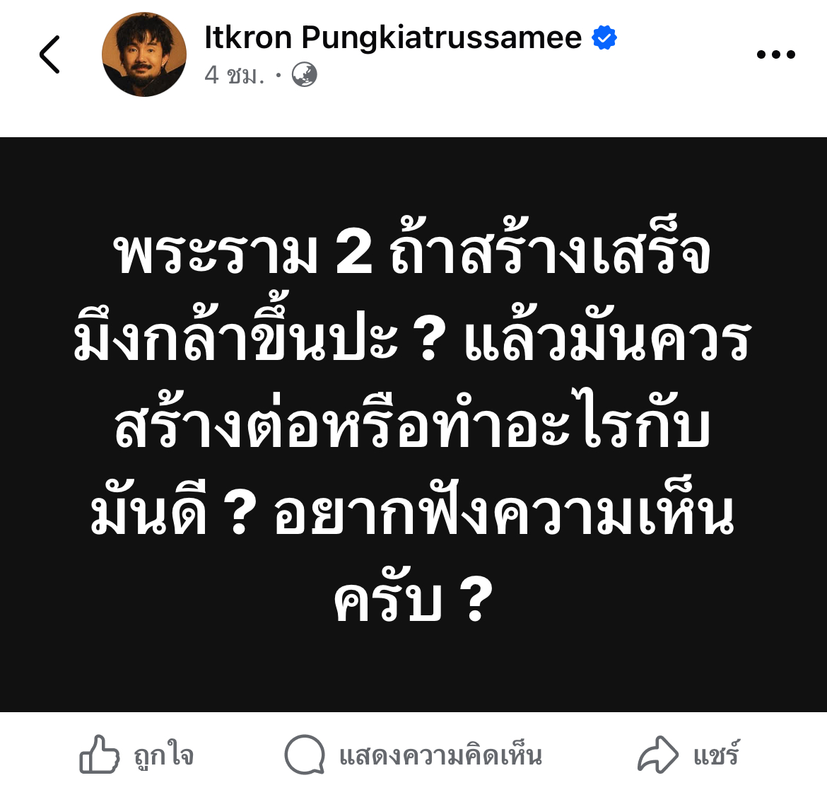 งานนี้ทำเอาศิลปินหนุ่มอย่าง “จ๋าย ไททศมิตร” ถึงกับนั่งไม่ติด ออกมาโพสต์ข้อความผ่านเฟซบุ๊กส่วนตัว ฟาดคำถามสุดพีคถึงมหากาพย์การก่อสร้างนี้ว่า “พระราม 2 ถ้าสร้างเสร็จ มึงกล้าขึ้นปะ? แล้วมันควรสร้างต่อหรือทำอะไรกับมันดี? อยากฟังความเห็นครับ?” หลังจากนั้นก็ได้มีแฟนคลับเข้ามาคอมเมนต์หนึ่งในนั้นคือ ก้อง ห้วยไร่ ที่คอมเมนต์ว่า“มึงใช้พื้นหลังดำนะไอ้หนวด“