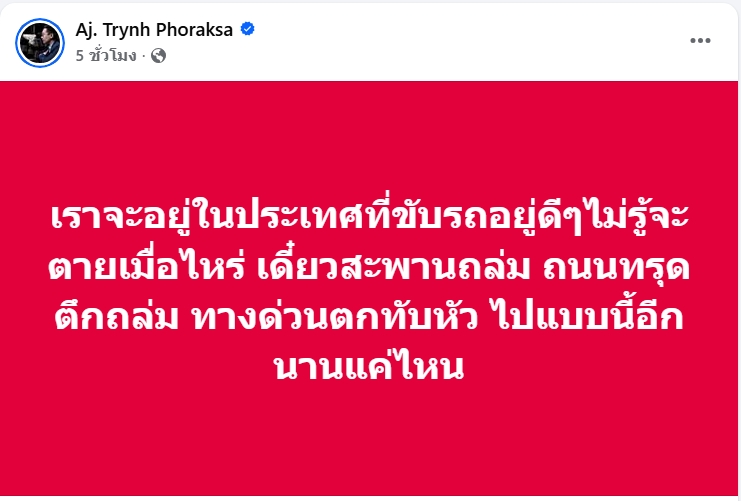 โดยข้อความระบุว่า “เราจะอยู่ในประเทศที่ขับรถอยู่ดีๆ ‘ไม่รู้จะตายเมื่อไหร่’ เดี๋ยวสะพานถล่ม ถนนทรุด ตึกถล่ม ทางด่วนตกทับหัว ไปแบบนี้อีก ‘นานแค่ไหน?'”