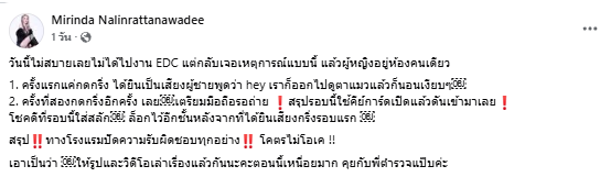 ผู้สื่อข่าวรายงานว่า ผู้ใช้โซเชียลรายหนึ่งได้โพสต์เล่าเหตุการณ์สุดระทึก หลังเข้าพักโรงแรมเพียงลำพัง เนื่องจากมีอาการป่วยจึงไม่ได้เดินทางไปร่วมงาน EDC ตามแผน แต่กลับต้องเผชิญเหตุการณ์ไม่ปลอดภัยภายในที่พัก โดยระบุว่าเกิดเหตุขึ้นในช่วงเวลาพักอยู่คนเดียว เป็นผู้หญิงเพียงลำพังในห้องพัก