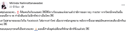 ผู้เสียหายระบุว่า ไม่สามารถโพสต์รายละเอียดทั้งหมดลงในเฟซบุ๊กได้ เนื่องจากข้อกฎหมาย และจะขอสรุปความคืบหน้าอีกครั้งเมื่อได้ข้อมูลครบถ้วน พร้อมขอบคุณทุกคนที่เป็นห่วง และยืนยันว่าขณะนี้ได้ย้ายออกจากโรงแรมดังกล่าวไปยังที่พักแห่งใหม่แล้ว เพื่อความปลอดภัย