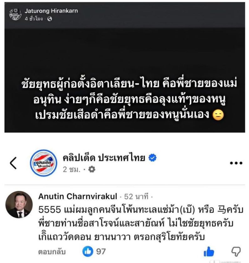 ศุภชัย ใจสมุทร ผู้สมัคร ส.ส.บัญชีรายชื่อ และประธานคณะทำงานด้านกฎหมาย พรรคภูมิใจไทย โพสต์เฟซบุ๊กชี้แจงกรณีมีผู้ใช้เฟซบุ๊กรายหนึ่งเผยแพร่ข้อมูล อ้างความเชื่อมโยงทางเครือญาติระหว่างบุคคลในวงการธุรกิจก่อสร้างกับ อนุทิน ชาญวีรกูล หัวหน้าพรรคภูมิใจไทย