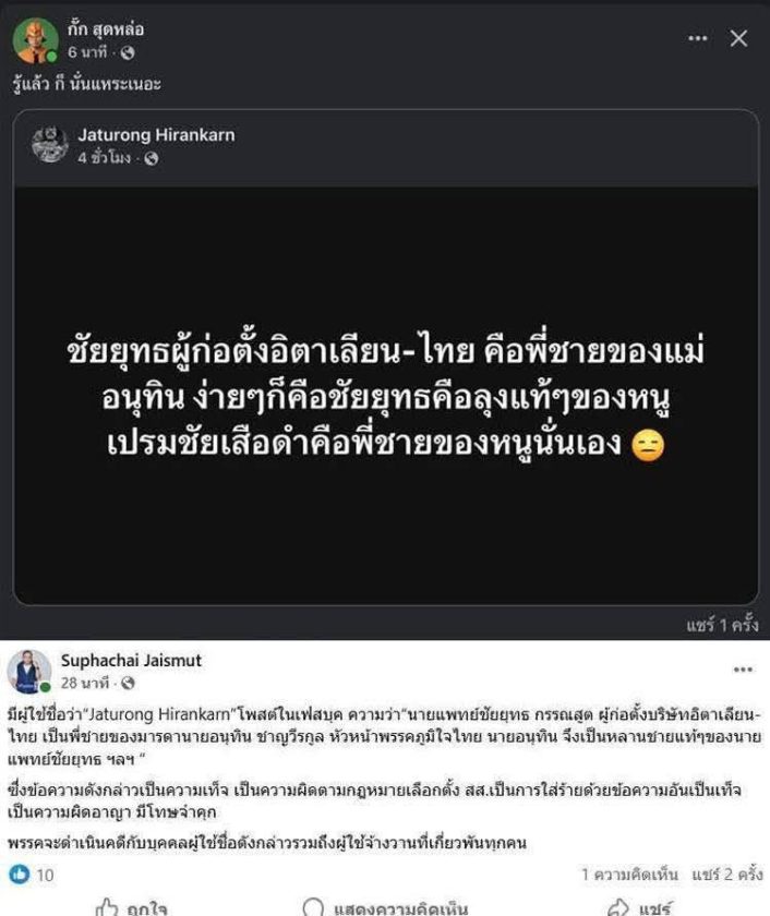 โดยข้อความดังกล่าวระบุว่า นพ.ชัยยุทธ กรรณสูต ผู้ก่อตั้งบริษัทอิตาเลียน-ไทย ดีเวล๊อปเมนต์ มีความเกี่ยวข้องทางเครือญาติกับนายอนุทิน ซึ่งศุภชัยยืนยันว่า เป็นข้อมูลเท็จ และเข้าข่ายการใส่ร้ายด้วยข้อความอันเป็นเท็จในช่วงการเลือกตั้ง
