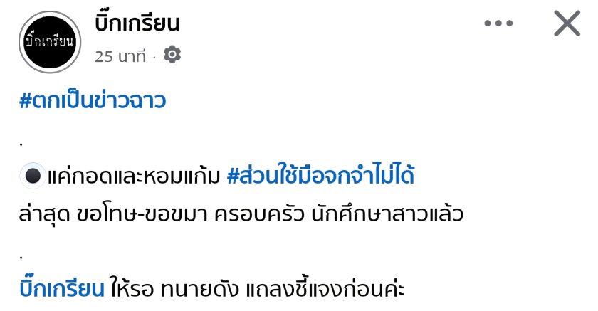 จากกรณีที่เพจ “บิ๊กเกรียน” และผู้ประกาศข่าวชื่อดัง “พุทธ อภิวรรณ” ได้เปิดเผยข้อมูลระบุว่า ทนายความชื่อดังที่กำลังตกเป็นข่าวฉาวได้เดินทางไปพบกับครอบครัวของนักศึกษาสาวคู่กรณีเพื่อทำการขอโทษและขอขมาต่อเหตุการณ์ที่เกิดขึ้น โดยเบื้องต้นทนายรายนี้ยอมรับว่ามีการ “กอดและหอมแก้ม” นักศึกษาสาวจริง