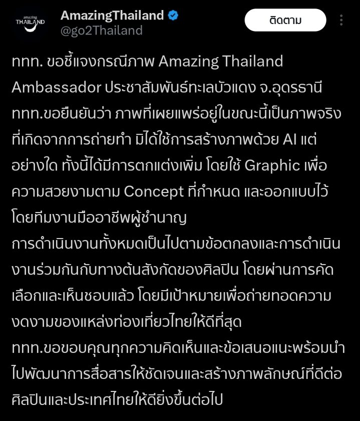 โดยทาง ททท. ได้ยืนยันชัดเจนว่า ภาพดังกล่าวเป็นภาพจริงที่เกิดจากการถ่ายทำ มิได้ใช้การสร้างภาพด้วย AI แต่อย่างใด อย่างไรก็ตาม ได้มีการใช้เทคนิคทางกราฟิกเพื่อตกแต่งภาพเพิ่มเติม เพื่อให้ภาพมีความสวยงามและเป็นไปตามคอนเซปต์ (Concept) ที่วางไว้ โดยทีมงานมืออาชีพผู้เชี่ยวชาญเป็นผู้ดำเนินการ