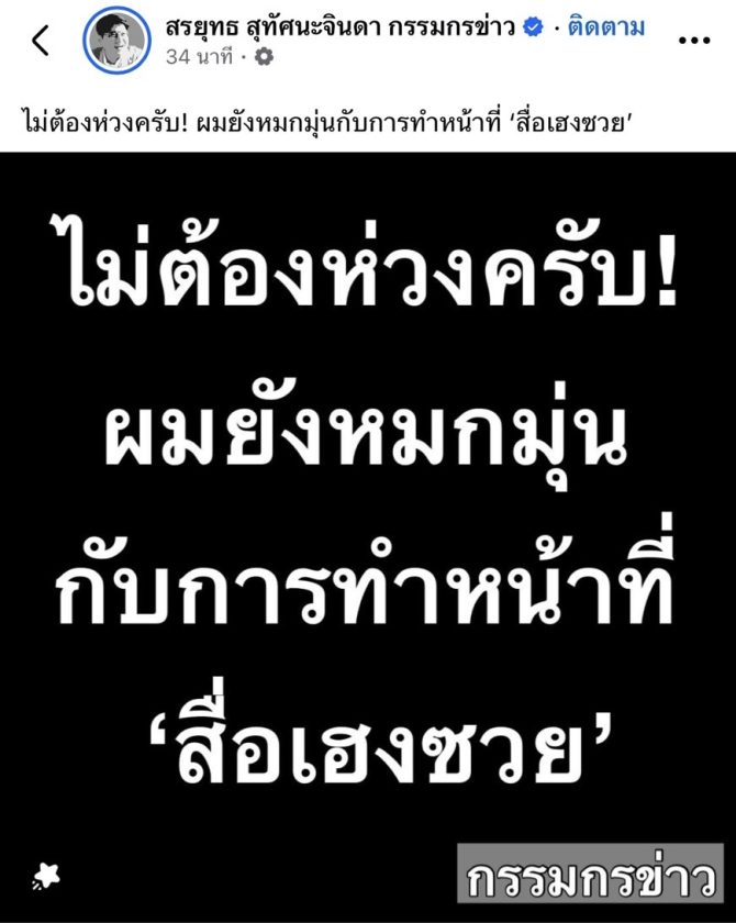 ล่าสุดได้โพสต์ระบุว่า ไม่ต้องห่วงครับ ผมยังหมกมุ่นกับการทำหน้าที่สื่อเฮงซวย ภายใต้โพสต์ดังกล่าว มีบรรดาแฟนข่าวและชาวเน็ตเข้ามาคอมเมนต์ให้กำลังใจอย่างล้นหลาม