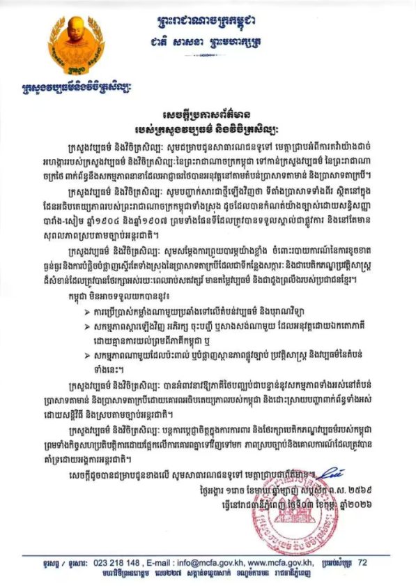 กระทรวงฯ บอกว่า กัมพูชาไม่สามารถยอมรับการใช้กำลังใด ๆ ต่อสถานที่ทางวัฒนธรรมและโบราณคดี กิจกรรมการบูรณะ อนุรักษ์ ขึ้นทะเบียน หรือก่อสร้างใด ๆ ที่ดำเนินการโดยฝ่ายเดียวโดยไม่ได้รับความยินยอมจากกัมพูชา หรือการกระทำใด ๆ ที่บั่นทอนสถานะทางกฎหมาย ประวัติศาสตร์ และวัฒนธรรมของสถานที่เหล่านี้