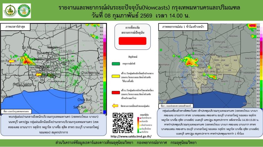 วันนี้ (8 ก.พ.69) กรมอุตุนิยมวิทยา พบกลุ่มฝนปานกลางถึงหนักบริเวณกรุงเทพมหานคร (เขตพระโขนง บางนา) นนทบุรี นครปฐม กลุ่มฝนเล็กน้อยถึงปานกลางบริเวณกรุงเทพมหานคร (เขตคลองเตย ยานนาวา จตุจักร พญาไท บางซื่อ ดุสิต สาทร ธนบุรี บางกอกใหญ่ จอมทอง) สมุทรปราการ โดยกลุ่มฝนเคลื่อนตัวทางทิศตะวันตก เข้าปกคลุมบริเวณกรุงเทพมหานคร (เขตพระโขนง บางนา คลองเตย ยานนาวา สาทร บางคอแหลม คลองสาน ธนบุรี บางกอกใหญ่ จอมทอง จตุจักร พญาไท บางซื่อ ดุสิต บางพลัด) นนทบุรี นครปฐม สมุทรปราการ
