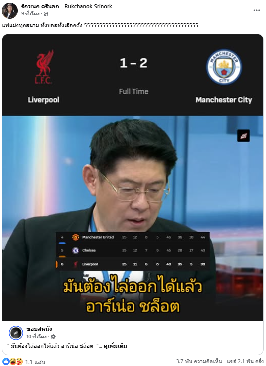 โดยภายหลังผลการเลือกตั้ง #เลือกตั้ง69 ที่พรรคประชาชนมีแนวโน้มพ่ายแพ้ให้กับพรรคภูมิใจไทย ขณะเดียวกัน ในศึกพรีเมียร์ลีก อังกฤษ เมื่อคืนที่ผ่านมา ทีมโปรดอย่าง “ลิเวอร์พูล” ก็พ่ายคาบ้านแอนฟิลด์ต่อ แมนเชสเตอร์ ซิตี้ ไปด้วยสกอร์ 1-2