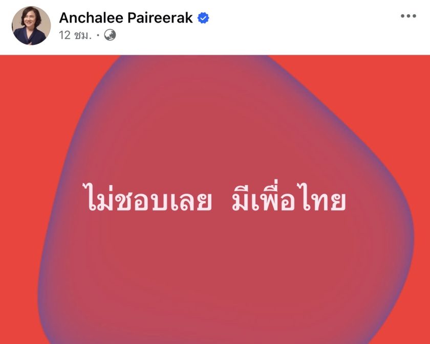 ต่อมาทางด้าน ปองอัญชลี ไพรีรัก ได้เคลื่อนไหวผ่านเฟซบุ๊กส่วนตัว เกี่ยวกับประเด็นการจัดตั้งรัฐบาล พร้อมระบุว่า “ ไม่ชอบเลยมีเพื่อไทย“