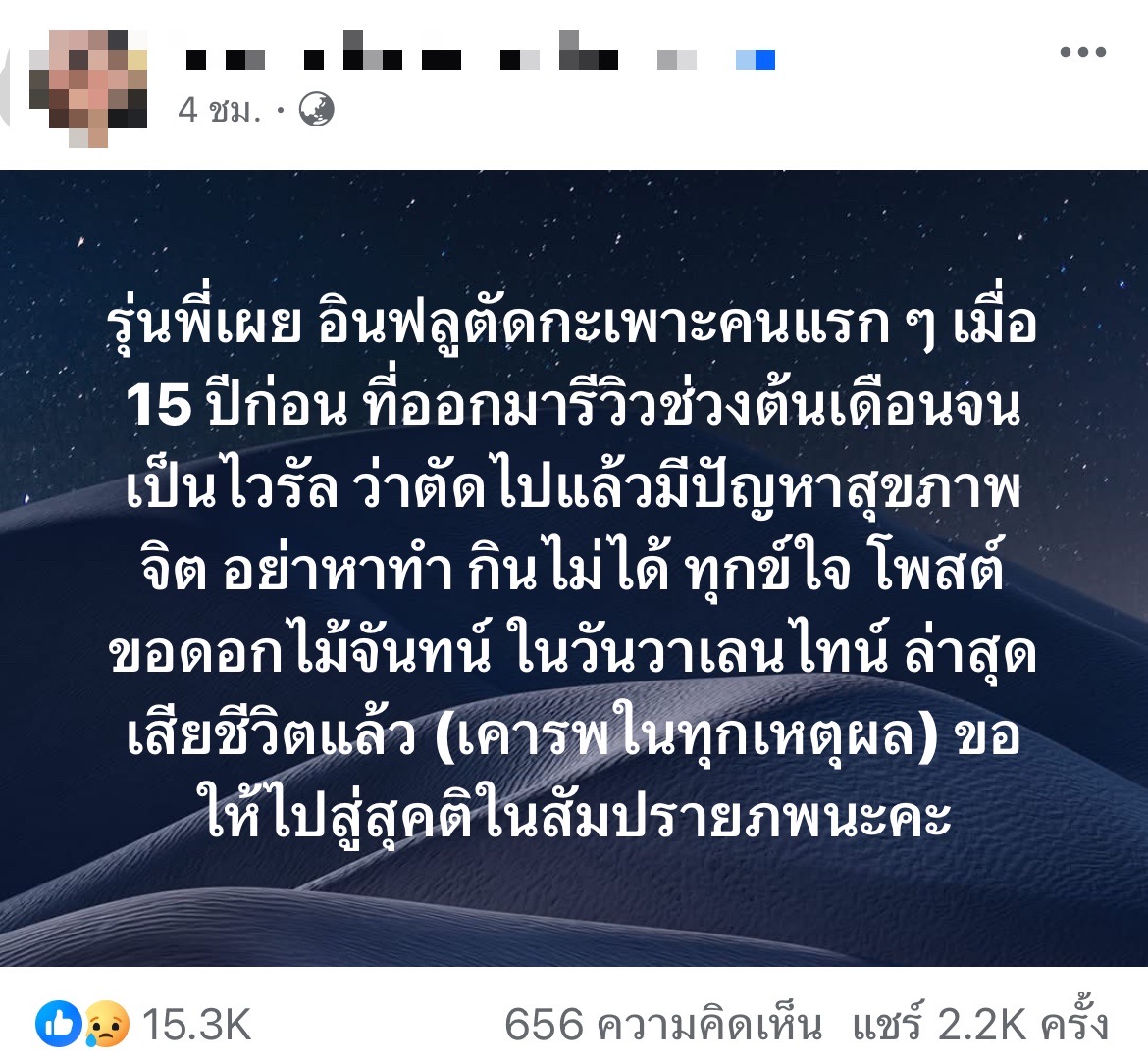 ในโพสต์ยังระบุด้วยว่า เจ้าตัวเคยโพสต์ขอดอกไม้จันทน์ในวันวาเลนไทน์ ก่อนจะมีรายงานว่าเสียชีวิตในเวลาต่อมา พร้อมข้อความแสดงความอาลัย “เคารพในทุกเหตุผล ขอให้ไปสู่สุคติในสัมปรายภพ”