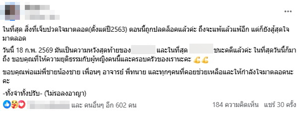 จากนั้นผู้เสียหายยังได้โพสต์ผ่านเฟซบุ๊กส่วนตัว ว่า “ในที่สุด สิ่งที่เจ็บปวดใจมาตลอด(ตั้งแต่ปี2563) ตอนนี้ถูกปลดล็อคแล้วค่ะ ถึงจะแพ้แล้วแพ้อีก แต่ก็ยังสู้สุดใจมาตลอด วันนี้ 18 ก.พ. 2569 มันเป็นความหวังสุดท้ายของ… และในที่สุด …ชนะคดีแล้วค่ะ ในที่สุดวันนี้ก็มาถึง ขอบคุณที่ให้ความยุติธรรมกับผู้หญิงคนนี้และครอบครัวของเรานะคะ ขอบคุณพ่อแม่พี่ชายน้องชาย เพื่อนๆ อาจารย์ พี่ทนาย และทุกๆคนที่คอยช่วยเหลือและให้กำลังใจมาตลอดนะคะ -ทั้งจำทั้งปรับ- (ไม่รอลงอาญา)”