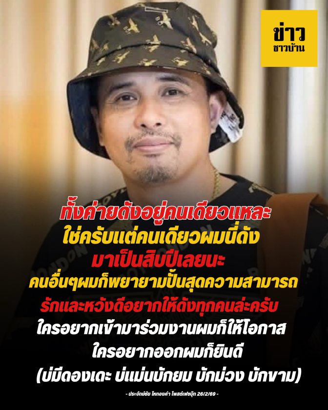 #ทั้งค่ายดังอยู่คนเดียวเเหละ ใช่ครับเเต่คนเดียวผมนี่ดังมาเป็นสิบปีเลยนะ…คนอื่นๆผมก็พยายามปั้นสุดความสามารถ รักเเละหวังดีอยากให้ดังทุกคนล่ะครับ..ใครอยากเข้ามาร่วมงานผมก็ให้โอกาส ..ใครอยากออกผมก็ยินดี(บ่มีดองเดะ บ่เเม่นบักยม บักม่วง บักขาม)