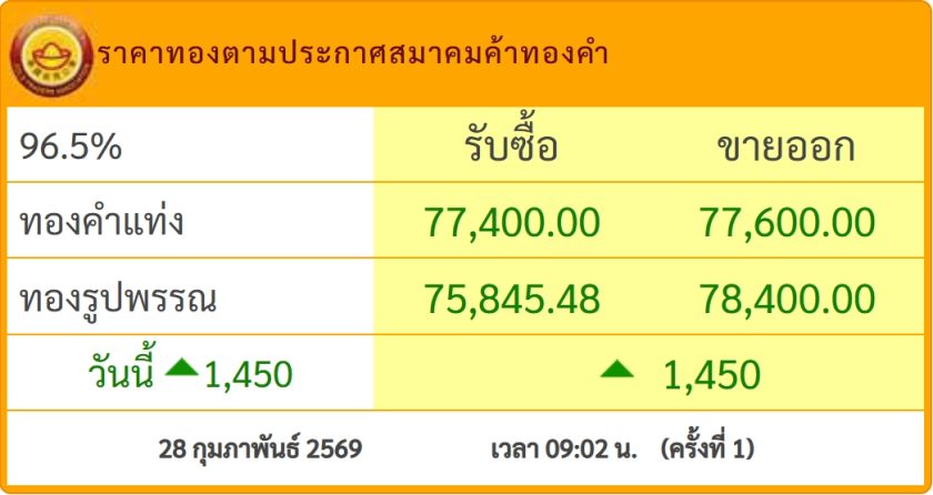 ราคาทอง โดยสมาคมค้าทองคำ รายงานราคาทองวันนี้ (28 ก.พ. 69) เปิดตลาดราคาทองปรับขึ้น 1,450 บาท ขายออกที่บาทละ 77,600 บาท โดยทองคำแท่งรับซื้อที่ 77,400 บาท ขายออกที่ 77,600 บาท ทองรูปพรรณรับซื้อที่ 75,845.48 บาท ขายออก 78,400 บาท