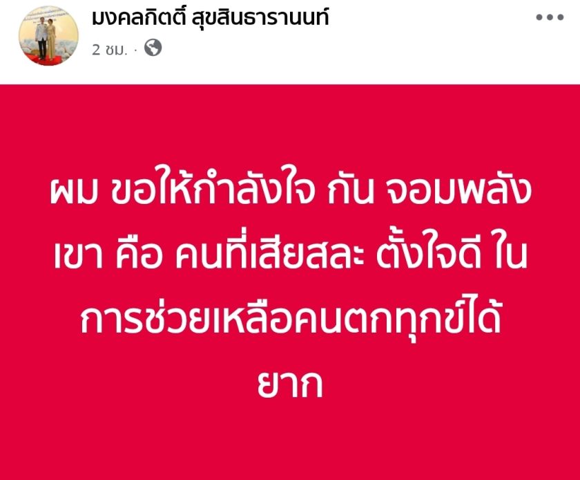 กลายเป็นกระแสที่น่าสนใจบนโลกโซเชียลมีเดียเมื่อ นายมงคลกิตติ์ สุขสินธารานนท์ อดีตสมาชิกสภาผู้แทนราษฎรและนักการเมืองชื่อดัง ได้ออกมาเคลื่อนไหวผ่านเฟซบุ๊กส่วนตัวด้วยการโพสต์ข้อความสั้น ๆ แต่เปี่ยมไปด้วยความหมาย เพื่อแสดงความชื่นชมและให้กำลังใจแก่ “กัน จอมพลัง” หรือ นายกัณฐัศว์ พงศ์ไพบูลย์เวชย์ อีกหนึ่งบุคคลสำคัญที่เดินหน้าขับเคลื่อนการช่วยเหลือสังคมอย่างต่อเนื่องในช่วงที่ผ่านมา