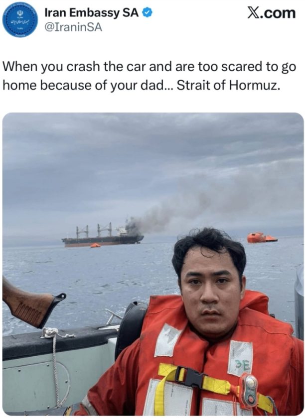บัญชี Iran Embassy SA ระบุข้อความว่า “when you crash the car and are too scared to go home because of youe daa…Strait of Hormuz”