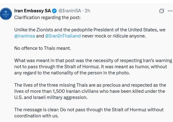 คำชี้แจงเกี่ยวกับโพสต์ – ไม่เหมือนกับพวกไซออนิสต์และประธานาธิบดีสหรัฐอเมริกา ที่เป็นพวกชอบล่วงละเมิดทางเพศเด็ก เรา @iraninsa และ @IranInThailand ไม่เคยล้อเลียนหรือเยาะเย้ยใคร ไม่ได้มีเจตนาที่จะล่วงเกินคนไทย สิ่งที่หมายถึงในโพสต์นี้คือ ความจำเป็นในการเคารพคำเตือนของอิหร่านในการผ่านช่องแคบฮอร์มุซ มันเป็นเพียงอารมณ์ขัน โดยไม่ได้คำนึงถึงสัญชาติของบุคคลในภาพ