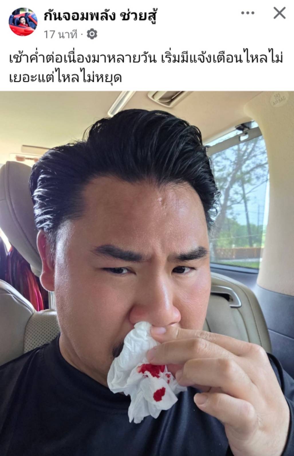 เรียกได้ว่าทำงานให้กับสังคมมาโดยตลอดระยะเวลาหลายปีที่ผ่านมาสำหรับ กัน จอมพลัง ล่าสุดเจ้าตัวได้อัพเดทสุขภาพผ่าน Facebook ทำเอาหลายคนถึงกับตกใจและเป็นห่วง โดยเจ้าตัวได้โพสต์ภาพเลือดกำเดาไหลให้แคปชั่นว่า “ เช้าต่อเนื่องมาหลายวัน เริ่มมีแจ้งเตือนไหลไม่เยอะจะไหลไม่หยุด“