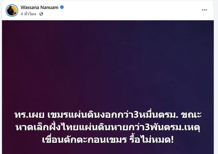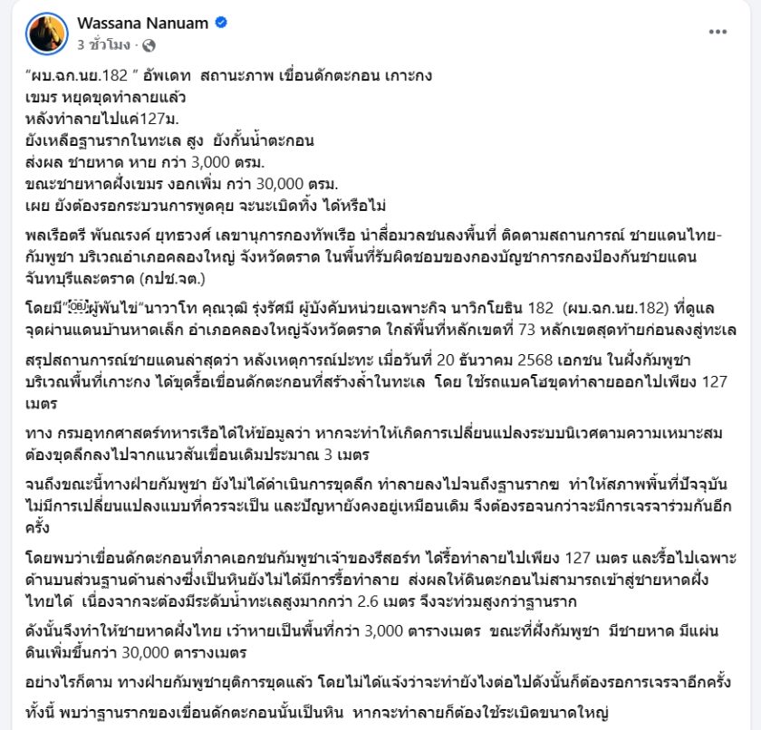สมาชิกเฟซบุ๊ก Wassana Nanuam นักข่าวสายทหาร ได้โพสต์เรื่องเกี่ยวกับ เขื่อนดักตะกอนเขมร ที่ทำให้เกิดผลกระทบต่อผืนแผ่นดินไทยโดยมีเนื้อหาอยู่ว่า