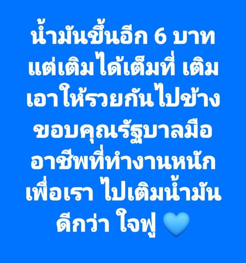 ”น้ำมันขึ้นอีก 6 บาท แต่เติมได้เต็มที่ เติมเอาให้รวยกันไปข้าง ขอบคุณรัฐบาลมืออาชีพที่ทำงานหนักเพื่อเรา ไปเติมน้ำมันดีกว่า ใจฟู 💙”