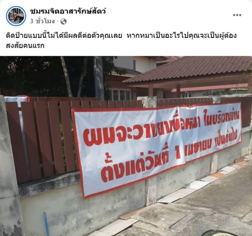 เมื่อวันที่ 30 มีนาคม 2569 ผู้สื่อข่าวรายงานว่า เพจ “ชมรมจิตอาสารักษ์สัตว์” ได้เผยแพร่ภาพพร้อมข้อความเตือนถึงกรณีการติดป้ายลักษณะข่มขู่สุนัข โดยระบุว่า การกระทำดังกล่าวไม่ได้ส่งผลดีต่อผู้กระทำเอง และหากเกิดเหตุไม่คาดคิดขึ้นกับสัตว์เลี้ยง เจ้าของป้ายอาจตกเป็นผู้ต้องสงสัยอันดับแรก